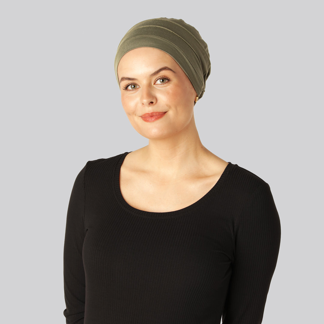 Stilfuld, klassisk bambus turban i olivengrøn – til kvinden der har hårtab Vores klassiske bambus turban i en smuk olivengrøn nuance er skabt med særligt fokus på kvinder, der oplever hårtab som følge af f.eks.