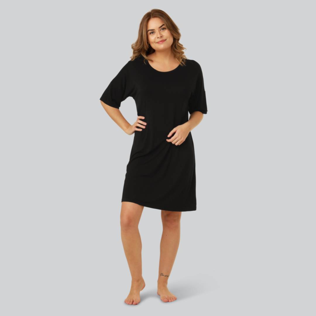 Oversized sort bambus natkjole med gode egenskaber Den sorte farve er en, der aldrig går af mode og en farve, der indbyder til søvn og afslapning. Men vores sorte natkjole er ikke kun forbeholdt, når du skal sove.