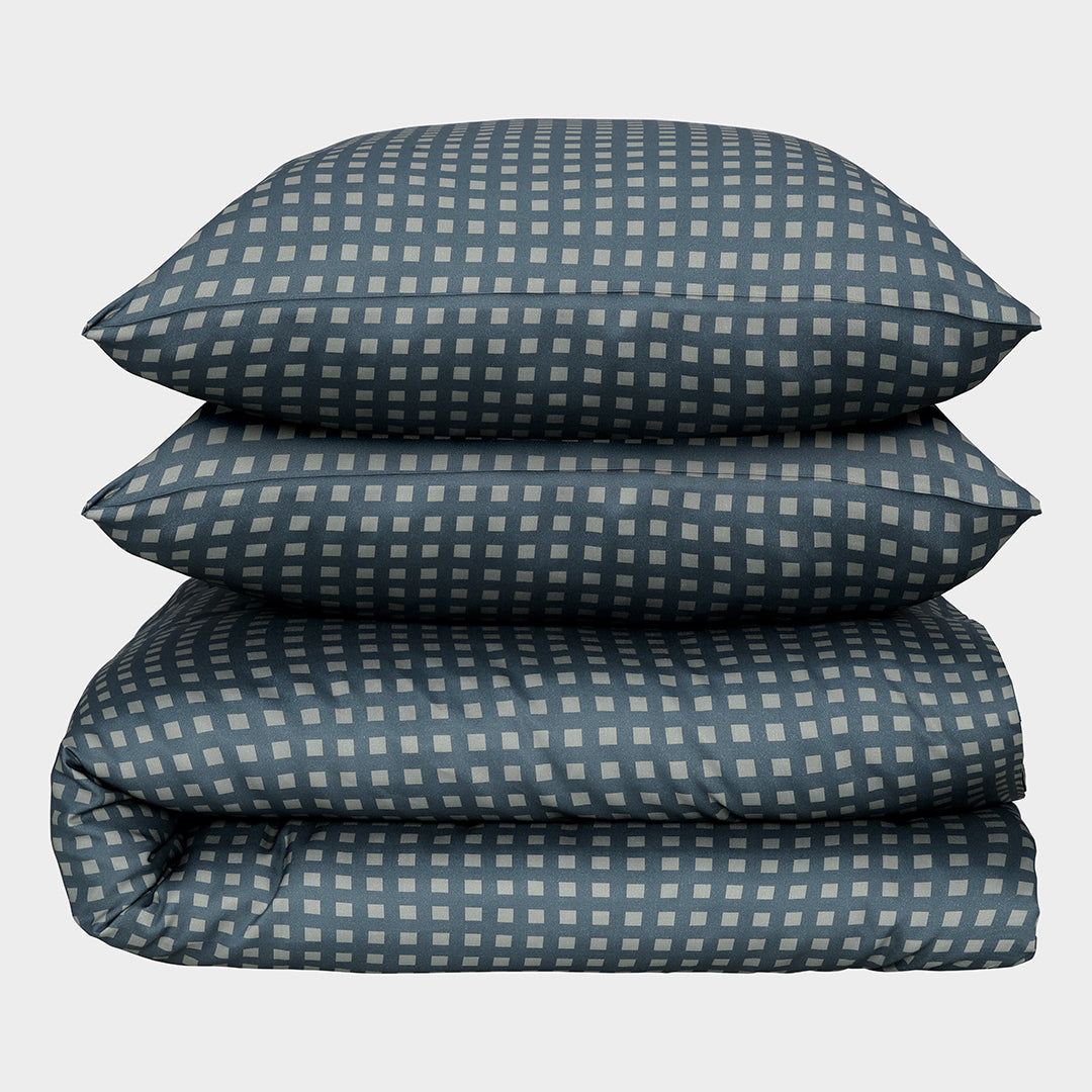 Unikt bambus sengetøj 200×220 i olivenfarvet og grålige blå tern Er du på udkig efter et mørkt sengesæt som giver dit soveværelse et blidt farve- og mønsterudtryk uden at forstyrre helhedsindtrykket?