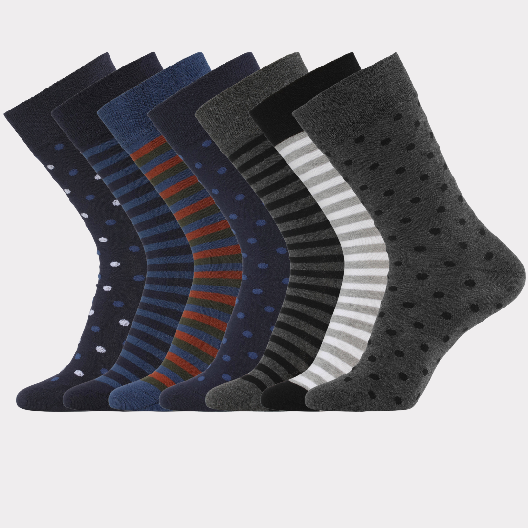 7 par stilrene og silkebløde bambus strømper fyldt med gode egenskaber Vores 7-pak bambus strømper med mønstre er en kvalitetsrig og behagelig tilføjelse til dit tøjskab, som med sine simple mønstre giver dit outfit en diskret farvepop.
