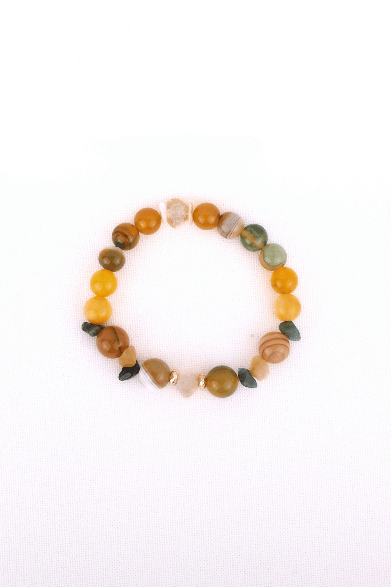 Materialer: Agat, Citrin, Aventurin, strandskaller & 18K forgyldt messing. Perlerne er nøje udvalgt i 10 mm for et harmonisk udtryk.