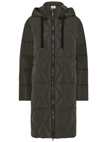 Lang quiltet jakke fra Etage. Jakken er quiltet i harlekinstern. Den har hætte med justerbar snøre samt to-vejs lynlås. Den har lommer i siden og er 100 cm. lang. Kvalitet: 100% genbrugspolyester Fyld: 100% genbrugspolyester