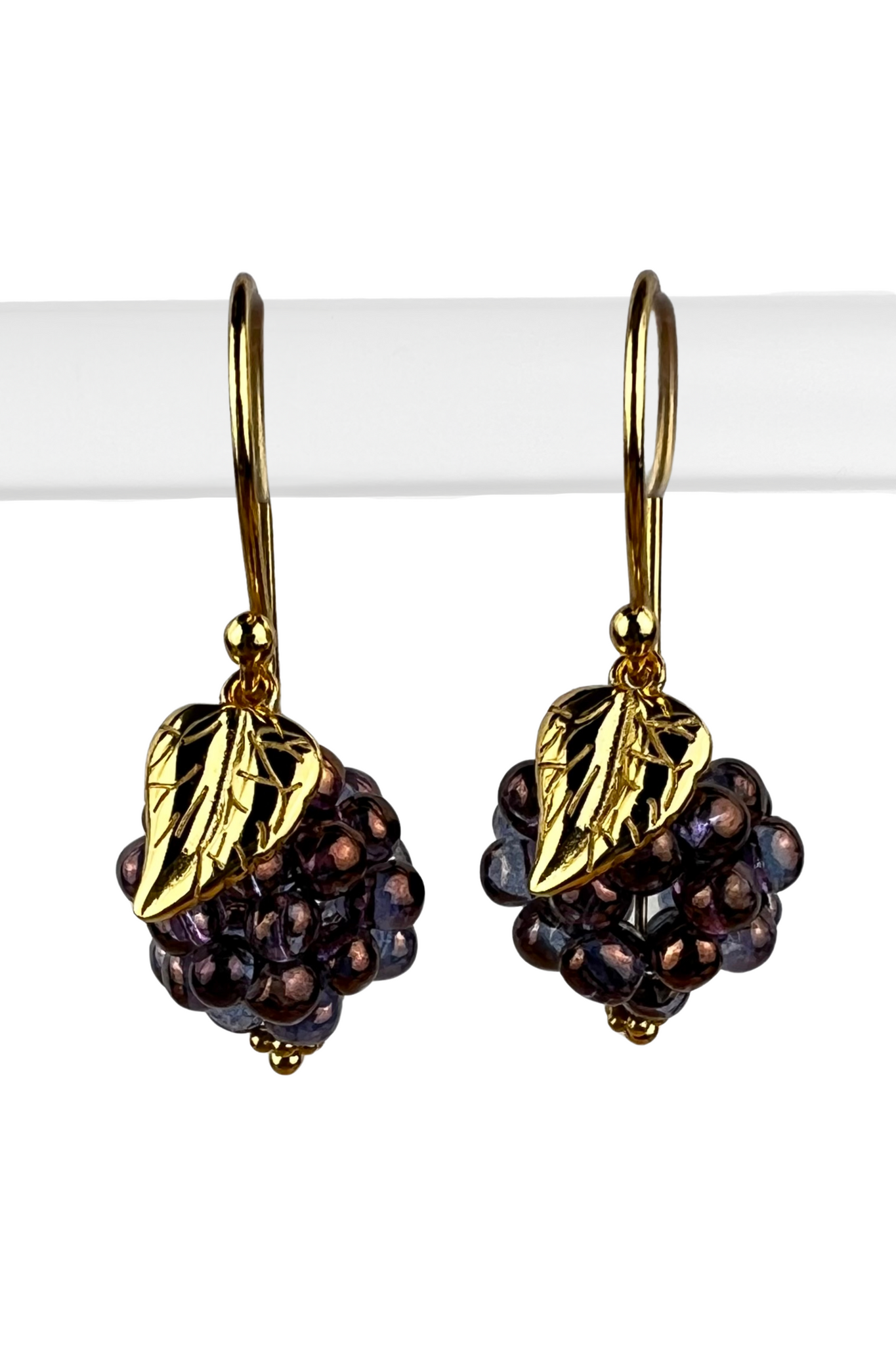 Dansk design og produktion Bærformede øreringe i changerende farver. Øreringene har en enkel og organisk form, og er lavet med eksklusive japanske perler. Hver perle skifter mellem violet og gyldenbrun, hvilket tilføjer dem et sofistikeret farvespil.