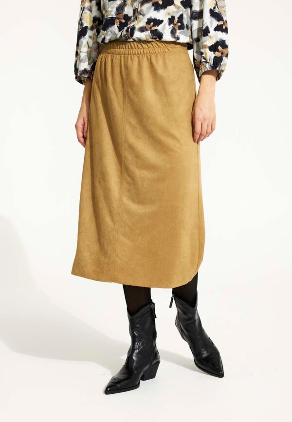 Moderne nederdel fra IN FRONT. Nederdelen er lavet i et flot ruskindslook – et must-have denne sæson. Nederdelen har en bred eleastikkant i taljen og er foret. Moderne, blød og behagelig nederdel, som kan styles med det meste – skjorter, bluser T-shirts o