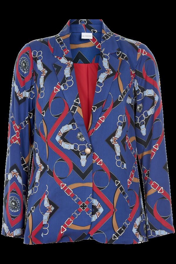 Skøn blazerjakke fra INFRONT. Jakken er enkel I snittet og lukkes med en forgyldt knap. Materialet er elegant viskose med det flotteste print. Jakken er foret men dejlig blød og let, så den føles som en let skjorte. Brug habitjakken med den tilhørende ned