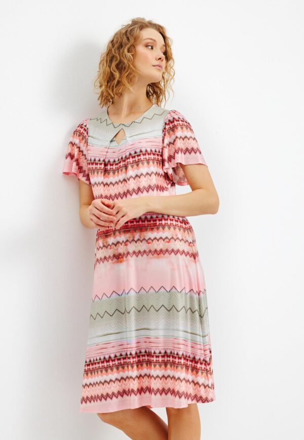 Smuk kjole fra IN FRONT. Kjole med flot halsudskæring med læg og lille kighul. Korte ærmer med vidde som falder smukt over skuldrene. Der er foer i kjolen og sving på skørtet. En flot knælang kjole der smyger sig om kroppen, og er perfekt i hverdagsgarder