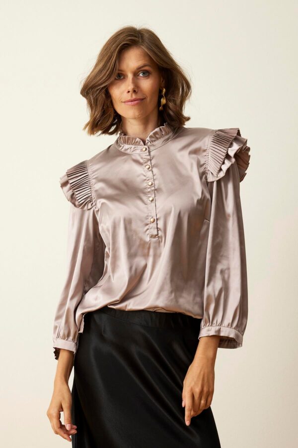 Fantastisk smuk og feminin skjorte fra IN FRONT. Skjorten har en masse feminine detaljer, heriblandt flæsekanter på skuldrerne og ved kraven. Der er knaplukning i halsen med fine, matte gyldne knapper. Skjorten har 3/4 lange ærmer med volumen. • Mand