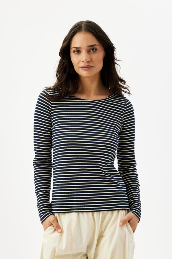 Flot, klassisk, stribet langærmet T-shirt i strækbar ribkvalitet. En dejlig blød T-shirt med en perfekt pasform, der holder formen. Et must-have i garderoben og kan bruges hele året rundt. • Martha T-shirt • Rund halsudskæring • Lange ærmer