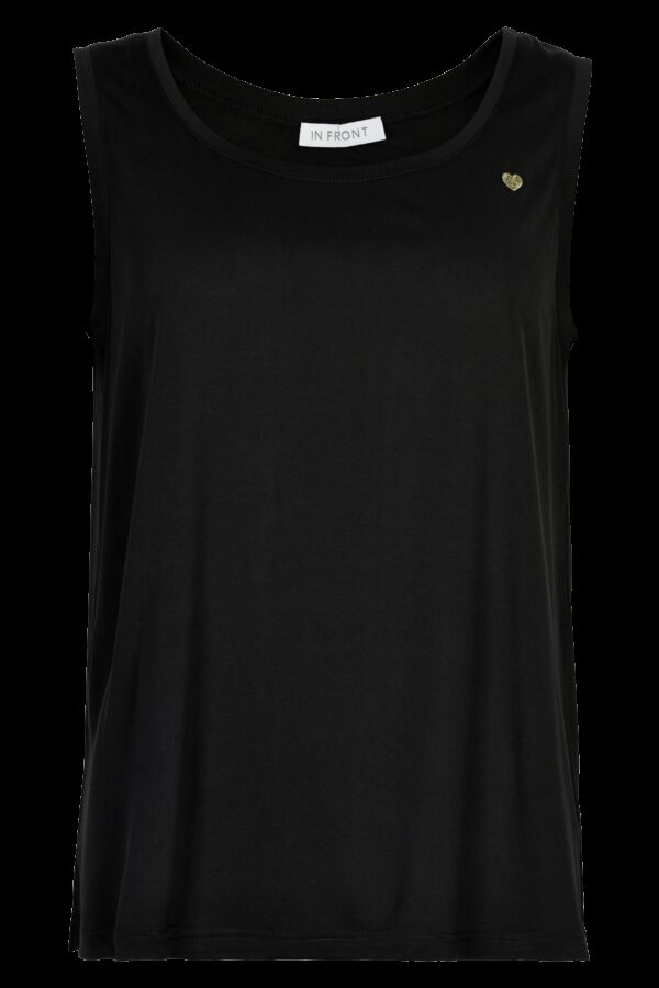 Sommertop fra INFRONT. Jersey top med stor rund hals der er afsluttet pænt med et kantebånd. Små rynker fra halskanten på for- og bagstykket som giver et fint feminin touch. Der er elastik i bunden som giver en pæn moderat balloneffekt til toppen. Flot ti