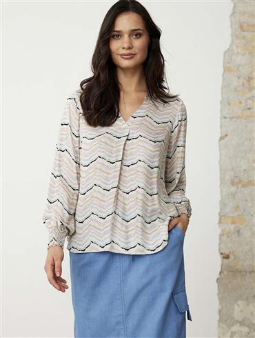 Smuk bluse fra In Front med et flot grafisk print. Blusen er med v-udskæring samt lange ærmer med elastikkant. Kvalitet: 100% viskose