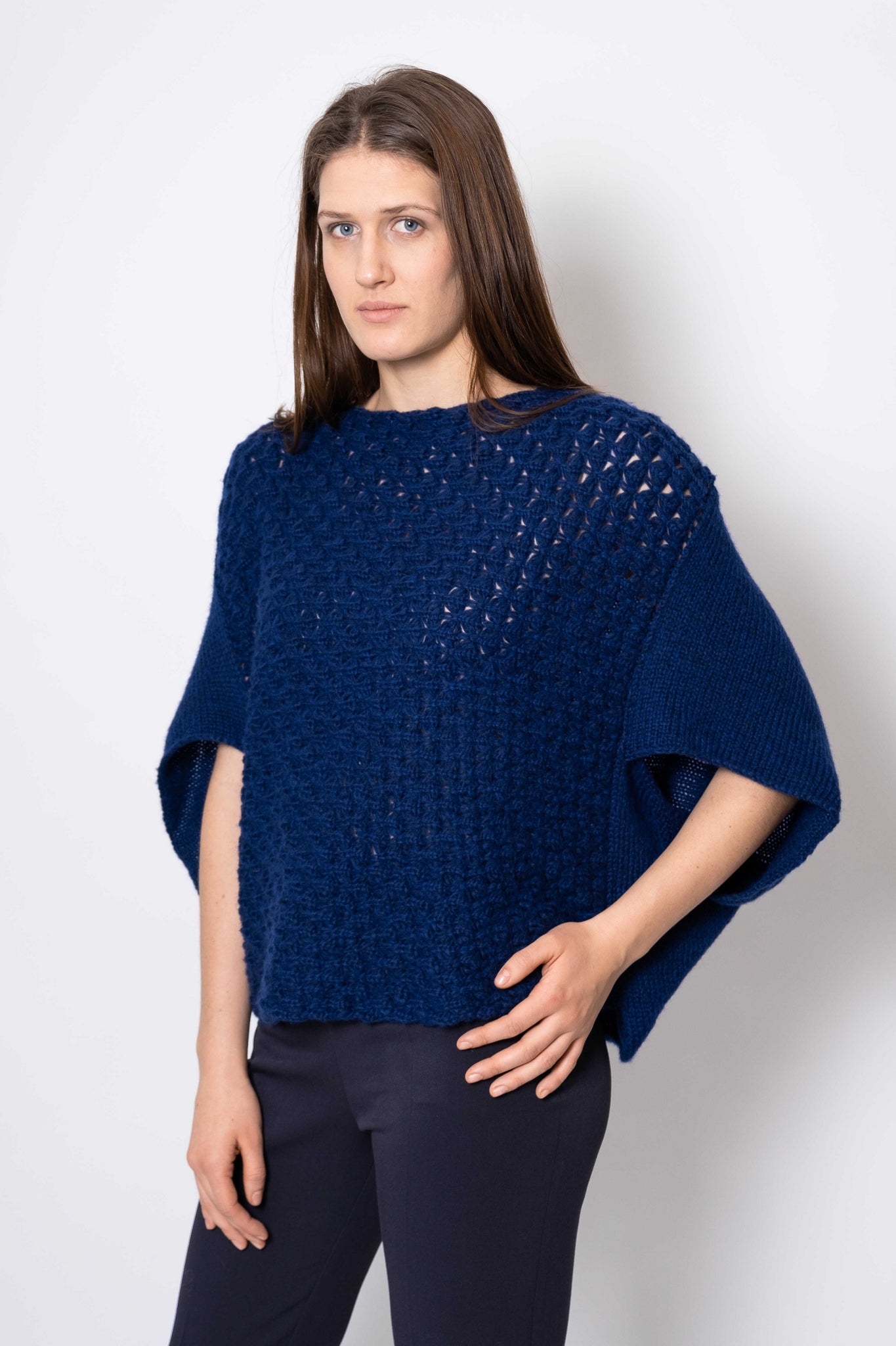 Smuk blød oversize striktrøje og poncho i ét er både til et seriøs forretnings møde og til en huggestund. Den er så stilfuld, at du nemt kan style den op med et par klassiske bukser i mørkeblå eller sort farve og ned med et par stramme jeans.